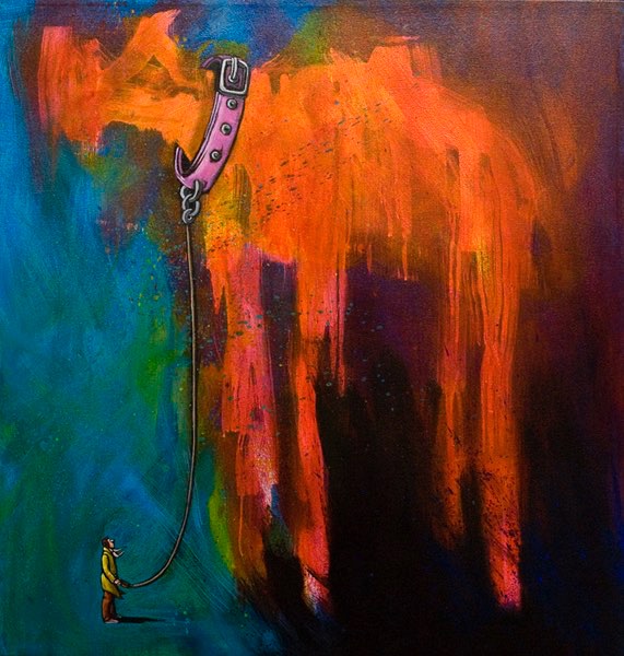 At that time there was a lot of works, from Finnish and international artists, who photographed miniature plastic figures in different settings constructed of everyday items. I found them very funny and started to play with the perspective and scale myself. I painted quite free and abstract colour first, and then started to add items such as giant trees or animals. And then I added some very small characters, with big noses, very comicbook-like, doing whatever in the middle of the colourfull mess. So much fun, and so much what I personally prefer: a play between drawing and painting, narrative content, humour and/or drama, sharp visual appearance.